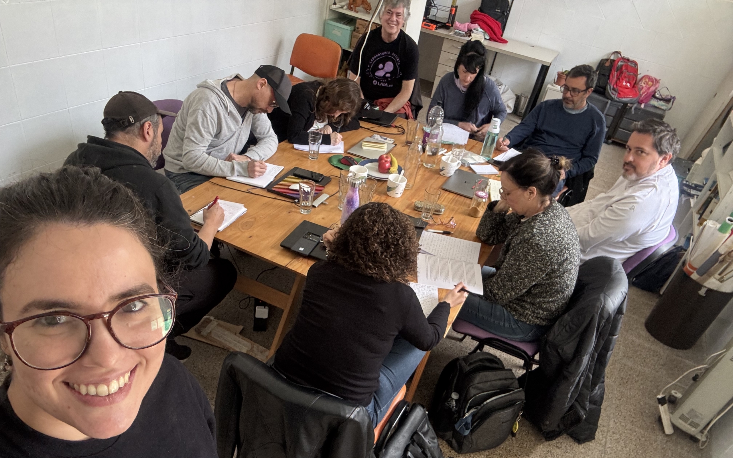 Durante las cuatro mañanas de los sábados de septiembre nos juntamos en la sede de LAIA, el espacio que retrata la foto. Un aula de escuela con estanterías llenas de cosas y una mesa grande de madera en el centro. A su alrededor fuimos dando forma a historias personales, fragmentos de artículos y papers, narraciones e ideas anotadas a mano. A veces con la compañía de la IA, otras no.